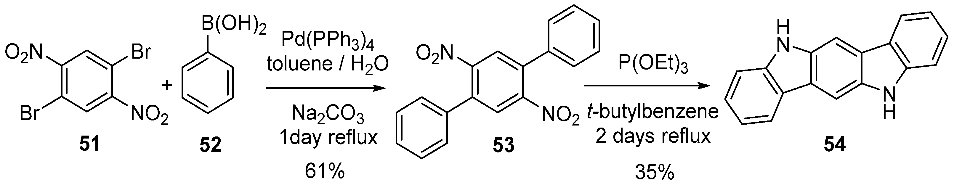 Müllen et al. were the first to prepare indolo[3,2-b]carbazole via a Cadogan ring closure. First, they prepared terphenyl compound 53 by performing a double Suzuki coupling on 1,4-dibromo-2,5-dinitrobenzene 51 and phenylboronic acid 52 in 61% yield. Then, the double Cadogan ring closure was performed to obtain the final compound 54 (Scheme 15) [41]. For another example see Leclerc et al. [42].