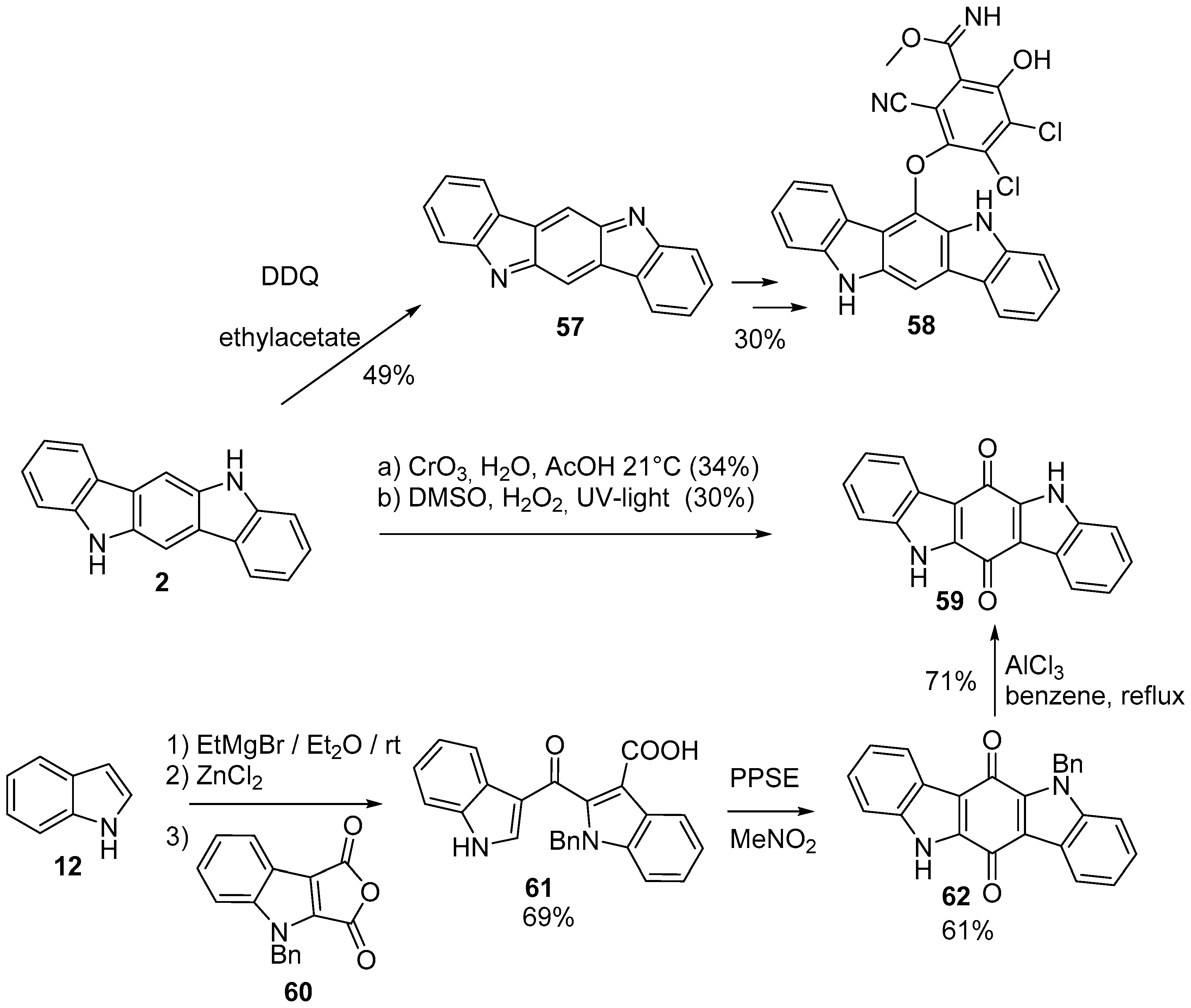 The same compound 59 can be obtained by reaction of anhydride 60 with metallated indole 12, followed by acid-catalyzed ring closure of the bisindole ketoacid 61 in a polar solvent and deprotection of 62 (30% overall yield) (Scheme 17) [46]. Substituted derivates of 59 were prepared by Youssef et al. by reacting substituted anilines and tetrabromo-p-benzoquinone in a three step reaction. Also similar ring expanded systems were prepared by this method [47].