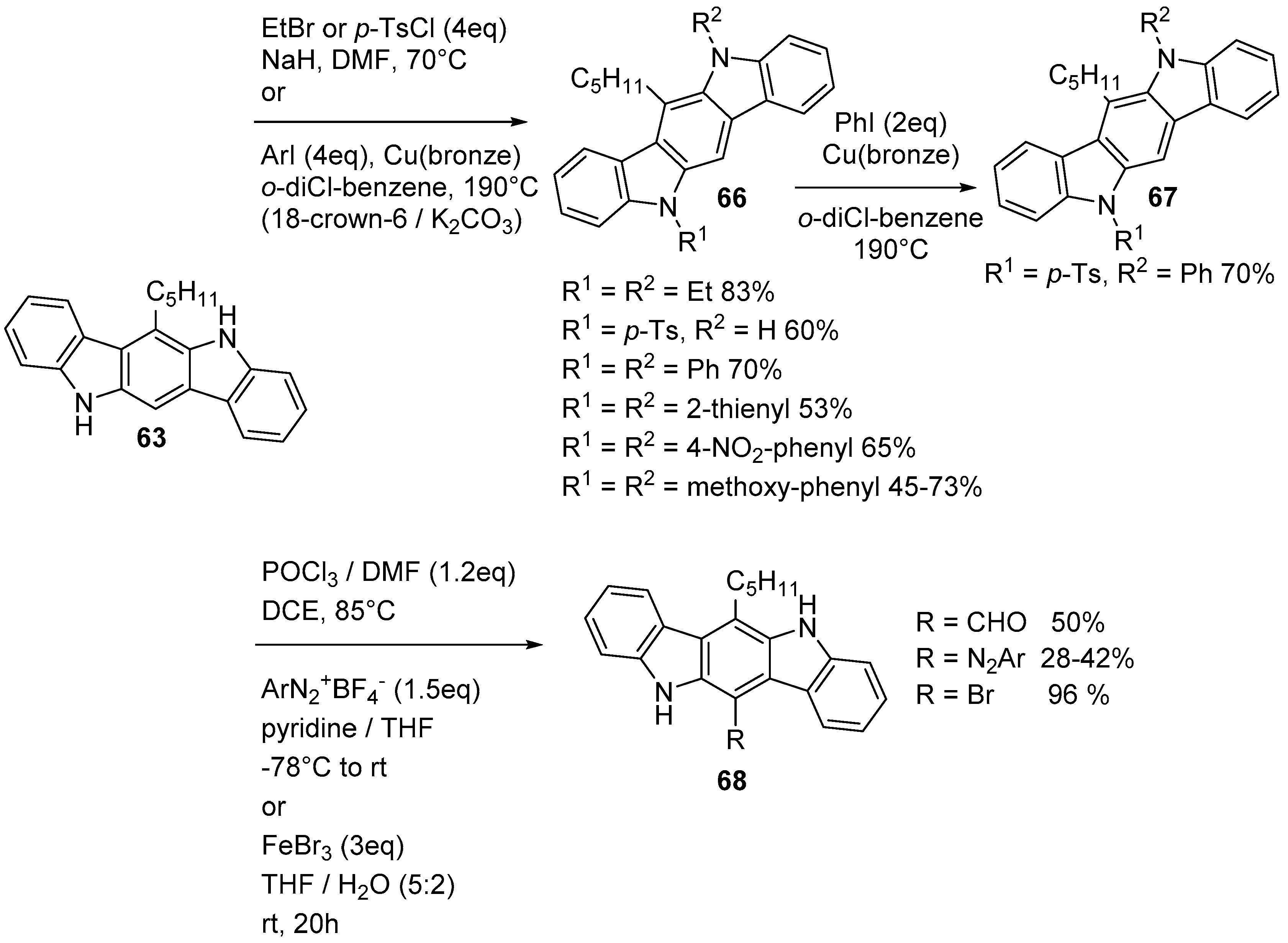 When using non-alkylated indolo[3,2-b]carbazole 63, the free meso-position has been found to be the most reactive one for formylation (50%), bromination (96%), and diazotation (28%–42%) to get indolo[3,2-b]carbazole 68 (Scheme 19) [31,51]. Brominated compound 68 was alkylated and then converted to 6-(4′-formylphenyl)-5,11-dimethyl-12-pentyl-indolo[3,2-b]carbazole, which was then used by Maes et al. to prepare meso-substituted porphyrins [52].