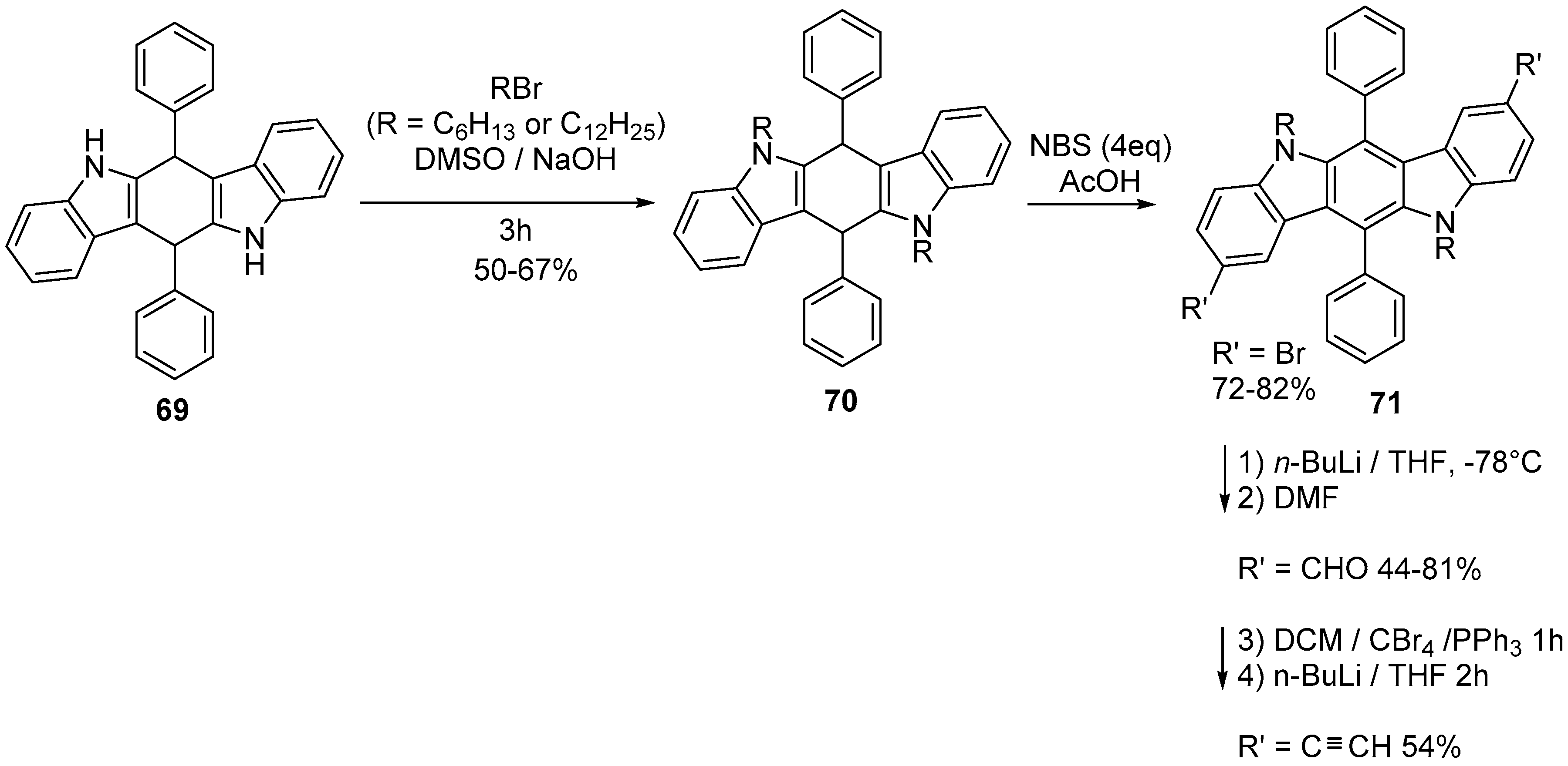 The tetrahydroindolocarbazole 69 which was obtained when benzaldehyde and indole were used for the condensation, has phenyl groups as substituents at both meso position. The compound is however not yet fully aromatic. The tetrahydroindolo[3,2-b]carbazole is first alkylated twice in 50%–67% yield to the more soluble indolo[3,2-b]carbazole 70 and then brominated with an excess of NBS, which at the same time aromatizes the middle ring, to obtain dihydroindolocarbazole 71. These bromine atoms can be converted to aldehydes and further to alkynes (Scheme 20) [32].