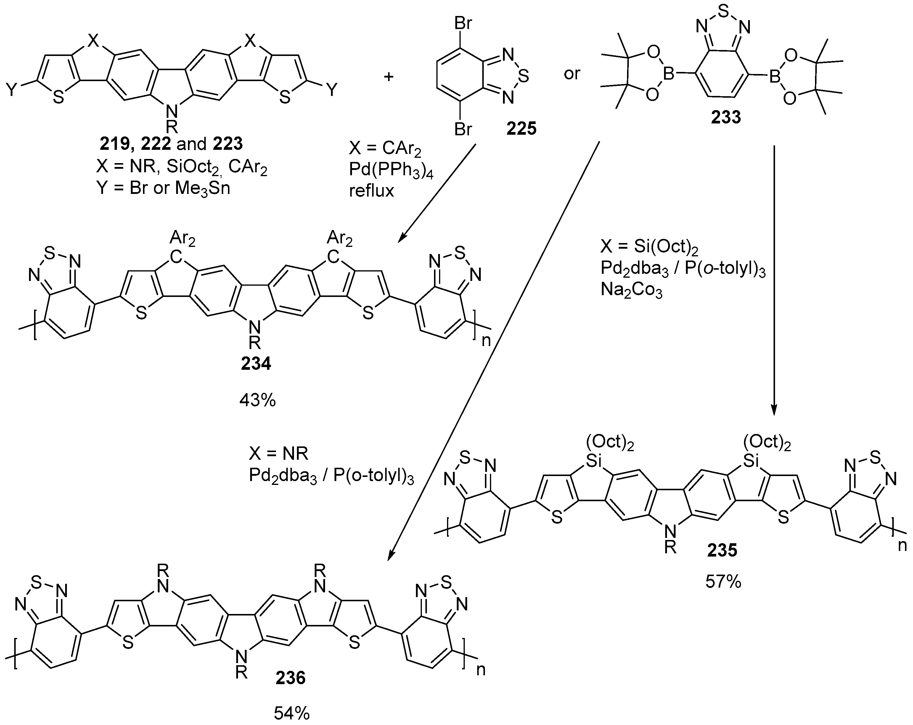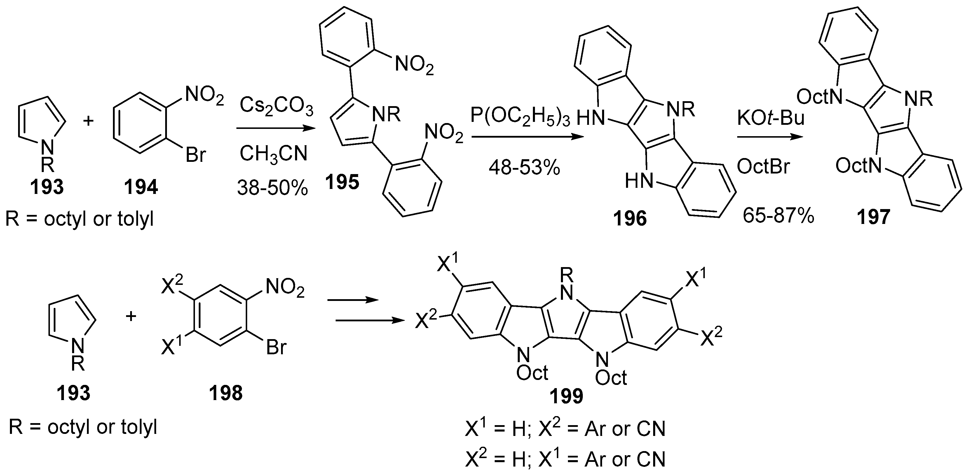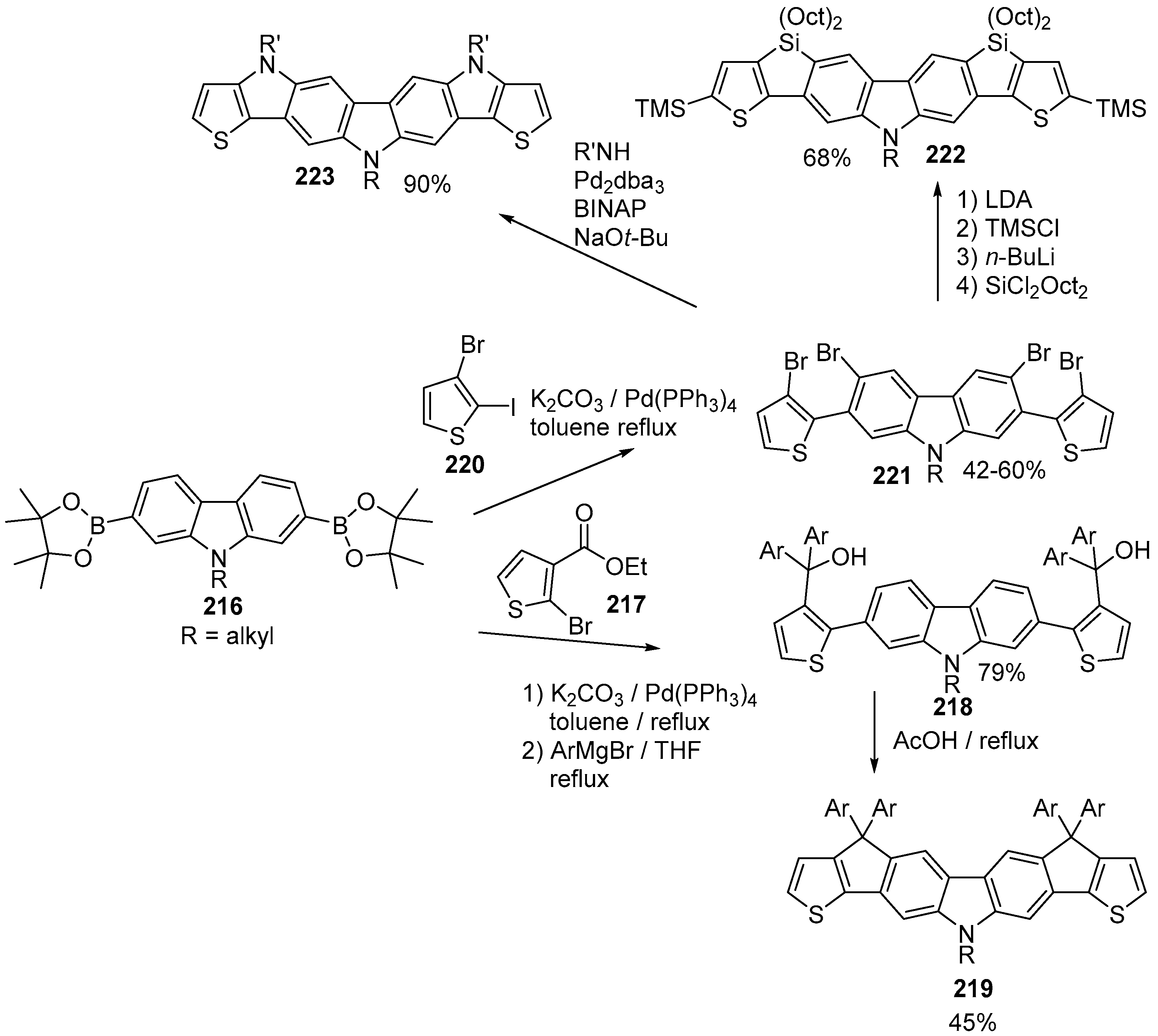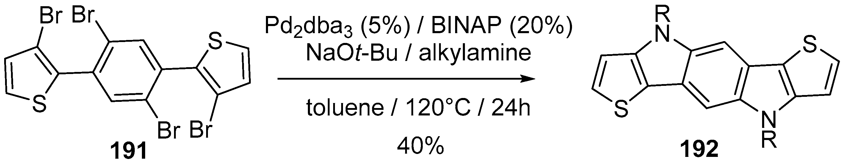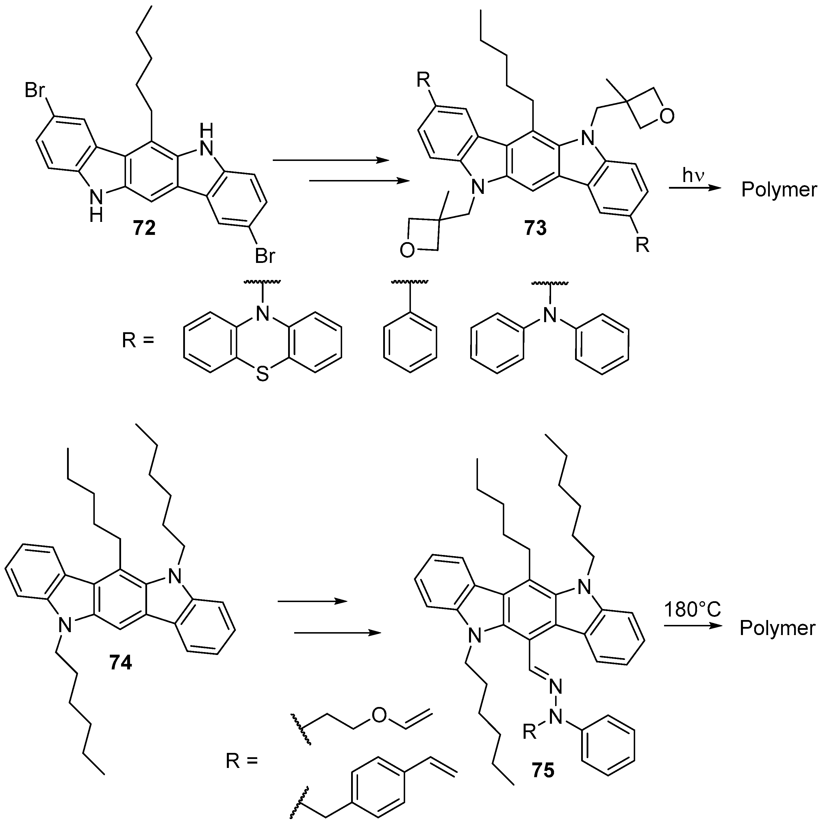 Grazulevicius et al. prepared indolo[3,2-b]carbazole polymers to be used as hole transporting materials and as emitting layer in OLEDs. The active material was prepared by alkylation of nitrogen and Buchwald–Hartwig amination of dibrominated indolo[3,2-b]carbazole 72 to prepare indolo[3,2-b]carbazole 73 which then was polymerized with acid catalysts.