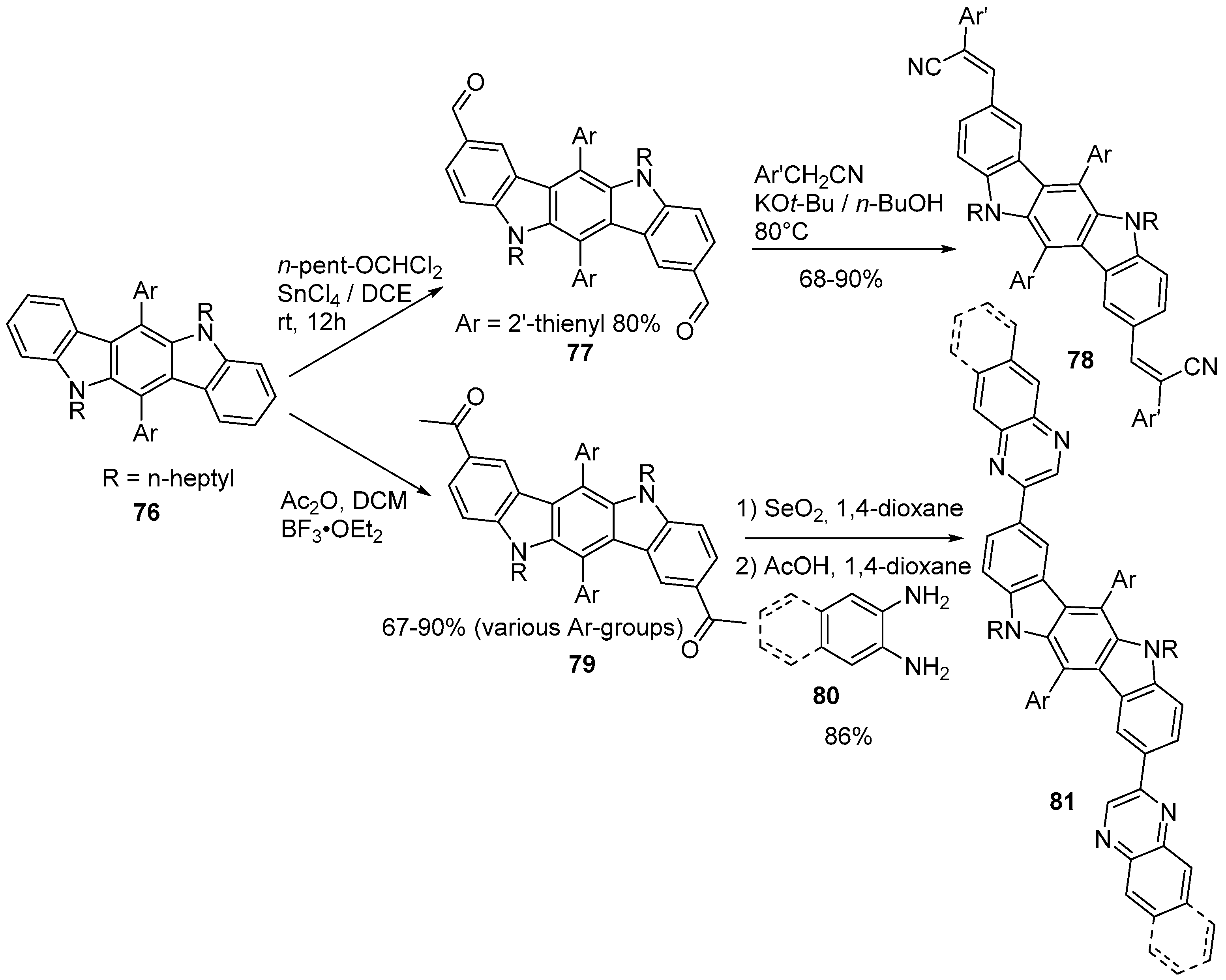 Irgashev et al. developed methods to introduce formyl and acyl groups on the 2- and 8-position of indolo[3,2-b]carbazole 76. The best results for the formylation reaction were obtained by using the “Rieche method”, using SnCl4 and dichloromethylpentyl ether in excess. The di-formylated compound 77 was obtained in 80% yield [58].