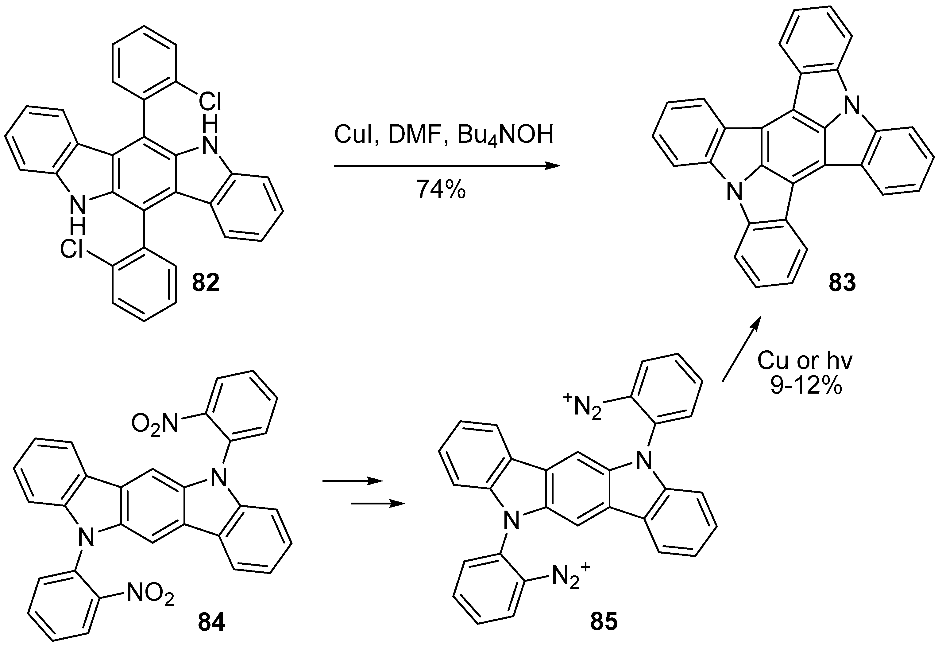 Khodorkovsky and coworkers prepared a new fused indolocarbazole donor system 83, by two different approaches. The first is starting from 6,12-bis(2-chlorophenyl)-5,11-dihydroindolo[3,2-b]carbazole 82, which twice undergoes an intramolecular Buchwald–Hartwig amination. The second method begins with 5,11-bis(2-nitrophenyl)-5,11-dihydroindolo[3,2-b]carbazole 84, also obtained through Buchwald–Hartwig amination of the parent indolo[3,2-b]carbazole. Reduction, diazotation to 85 and insertion at the meso position gives the same ring closed product 83. The yield of the compound via this approach is however lower than for the previous method due to formation of other isomers (Scheme 23) [60,61].