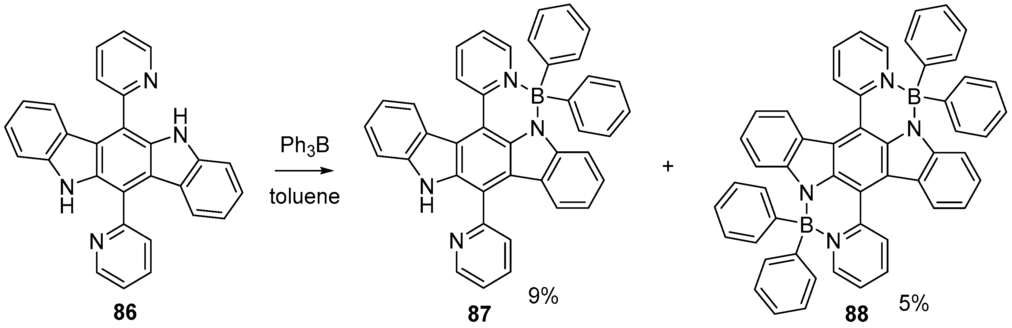 Curiel et al. performed the condensation of indole with pyridine-2-carboxaldehyde to obtain indolo[3,2-b]carbazole 86. This indolo[3,2-b]carbazole has then been converted into a complex with triphenylborane to obtain products 87 and 88 (Scheme 24). The maximum absorption peak in DCM shifted from 441 nm (no complexation), over 545 (once complexed) to 643 nm (double complexation) [62].