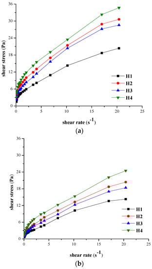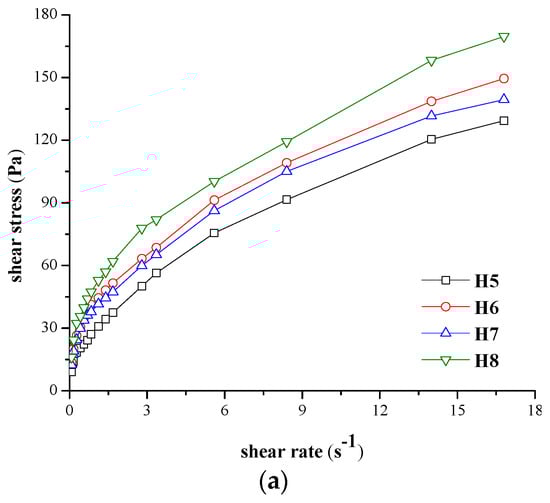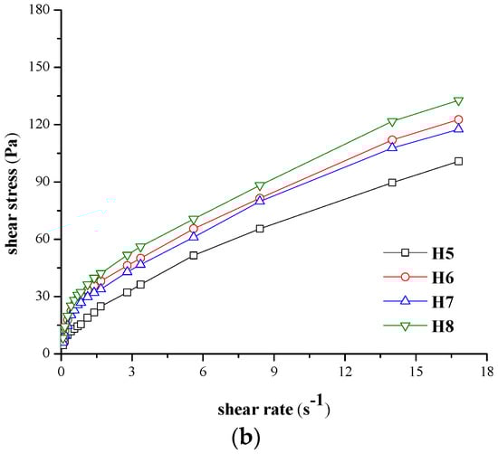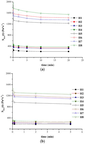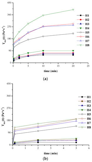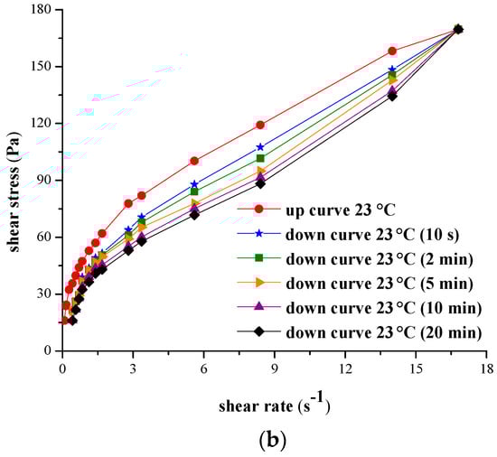 The shapes of the rheograms illustrated in Figure 6b show that for the maximum rotational speed selected, the increase of the stirring time induces a viscosity decrease, and the backward curve corresponds to decreasing values of the shear stress for the same shear rate.