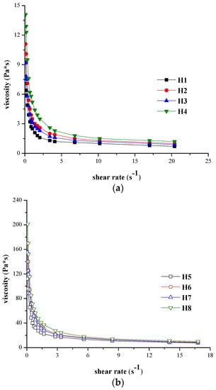 The hydrogels pseudoplasticity can also be expressed through the forward curves viscosity vs. shear rate, presented for exemplification in Figure 3a,b.