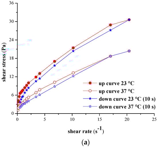 The flow patterns recorded in Figure 6a,b indicate that the hydrogels are thixotropic at both temperatures, for the same shear rate, the point on the backward profile corresponding to lower shear stress in comparison with the forward one, obtaining the corresponding hysteresis loops [29].