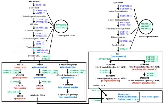 Metabolic pathways involved in the biosynthesis of aliphatic and indolic glucosinolates (GSL) after Liu et al. [10], along with the related genes of B. oleracea. The GSL molecules measured by HPLC are denoted as red bold (see Table S1 for their chemical structure names). The relative expression level of green bold genes was measured by qPCR. Numbers in parentheses denote the number of genes involved in this process (Adopted from Yi et al. [5]).