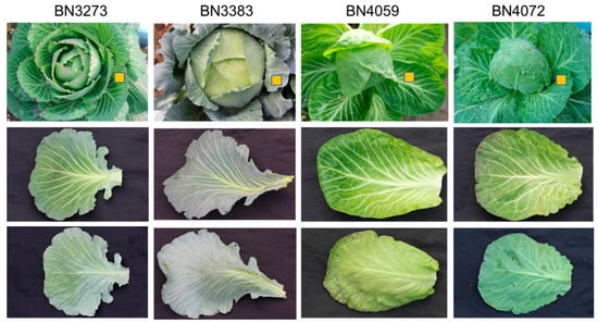 Genotypic variation in the leaf morphology of middle-aged leaves of four B. oleracea capitata inbred lines. Each column represents the whole plant, the upper- and lower-surface of an individual leaf, respectively. The leaves marked with orange-boxes were sampled. The inbred line BN3273 was the calibrator in the relative expression analysis.