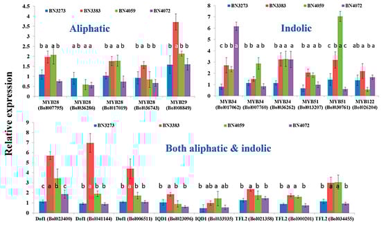 Relative expression level of transcription factor-related genes in four cabbage inbred lines involved in aliphatic, indolic and both aliphatic and indolic glucosinolate biosynthesis in B. oleracea. Vertical bars indicate the standard deviation of the means of nine observations. Different letters (a, b, c) indicate statistically significant difference between inbred lines.