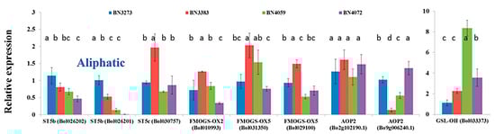 The inbred line BN3383 accounted for a high level of gene expression up to two-fold for the following aliphatic glucosinolate biosynthesis genes: ST5c accession Bol030757, FMOGS-OX2 accession Bol010993, FMOGS-OX5 accessions Bol031350 and Bol029100; compared to the control line BN3273 (Figure 4, Table S2). Inbred lines BN4059 and BN4072 accounted for a strikingly lower expression level of ST5b accession Bol026201 compared to the other two lines, BN3383 and BN3273 (Figure 4, Table S2). The gene AOP2 (Bol9g006240.1) had more than a seven-fold lower level of relative gene expression in the inbred line BN3383 compared to the control line BN3273 (Figure 4, Table S2). Another aliphatic transcription factor-related gene GSL-OH (Bol033373) had more than an eight-fold higher expression level in the inbred line BN4059 (Figure 4, Table S2).