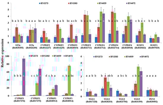 The glucosinolate break-down-related gene TGG5 (Bol031599) was expressed highly in the inbred lines BN4059 and BN4072 compared to BN3273 and BN3383 (Figure 5, Table S2). The level of expression of two other break-down-related genes, TGG1 (Bol017328) and TGG2 (Bol025706) in the BN4059 and BN4072 lines, was remarkably low compared to the BN3273 and BN3383 lines (Figure 5, Table S2).