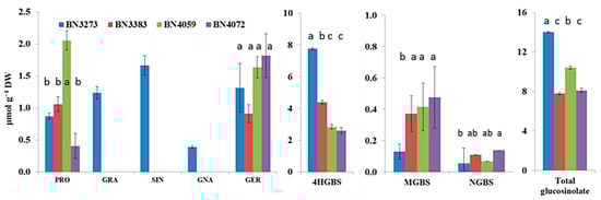 Contents of aliphatic and indolic glucosinolates produced in four inbred lines of cabbage. Vertical bars indicate the standard error of the means of nine observations. The response factors for glucosinolate quantification were obtained from European Economic Community [32], International Standards Organization [33] and American Oil Chemists Society [34]. Different letters (a, b, c) indicate statistically significant difference between inbred lines. PRO, progoitrin; GRA, glucoraphanin; SIN, sinigrin; GNA, gluconapin; GER, glucoerucin; 4HGBS, 4-hydroxy-glucobrassicin; MGBS, methoxy-glucobrassicin and NGBS, neoglucobrassicin.