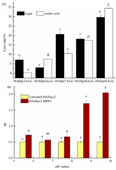 Comparison of (a) the loss rates of sugar and amino acid contents, and (b) the BI between unheated HAHp-G and HAHp-G MRPs produced at different pH values. Data were presented as mean ± SD (n = 3). Different letters (a–d) and capital letters (A–E) in Figure 1a represented significant difference in sugar loss rate and amino acid loss rate, respectively (p < 0.05). Different letters (a–d) in Figure 1b represented significant difference in BI (p < 0.05).