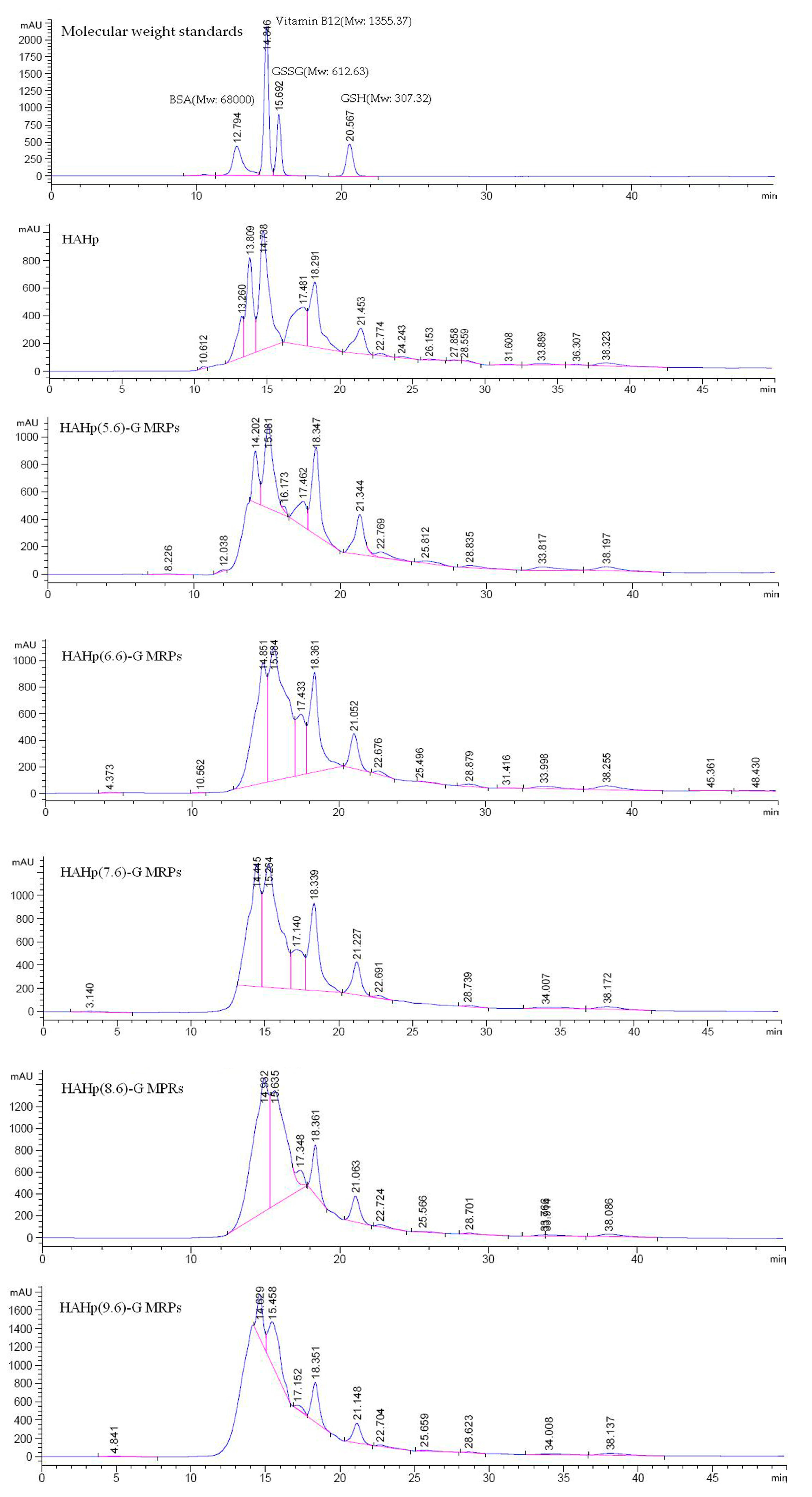 Elution profiles of HAHp and HAHp-G MRPs (prepared at pH 5.6, 6.6, 7.6, 8.6, and 9.6) on HPLC system using a PL aquagel-OH 30 column (7.5 × 300 mm, 8 μm), eluted with 50 mM sodium phosphate buffer (pH 5.8) under a flow rate of 0.5 mL/min.