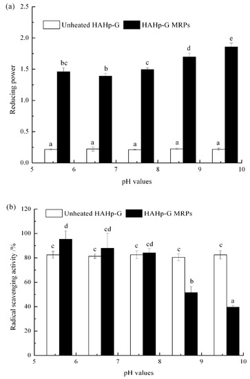 The initial pH strongly influences the proportion of amino acids in the unprotonated form and, thus, determines the augment of MR [42]. HAHp-G MRPs prepared at different pH values showed different antioxidative activities in terms of reducing power and DPPH radicals scavenging (Figure 3). The reducing power of HAHp-G MRPs was dramatically enhanced along with increased pH values (Figure 3a). HAHp(9.6)-G MRPs, which were produced at initial pH of 9.6, displayed near eight-fold reducing power capacities than its control group (unheated HAHp(9.6)-G). Noticeably, when it comes to the DPPH radicals scavenging rate, the HAHp(5.6)-G MRPs, prepared at pH 5.6, reached to 95.30% (Figure 3b), which was much higher than those of the control (unheated HAHp(5.6)-G) (82.48%), the HAHp(8.6)-G MRPs (51.54%), and the HAHp(9.6)-G MRPs (39.57%).