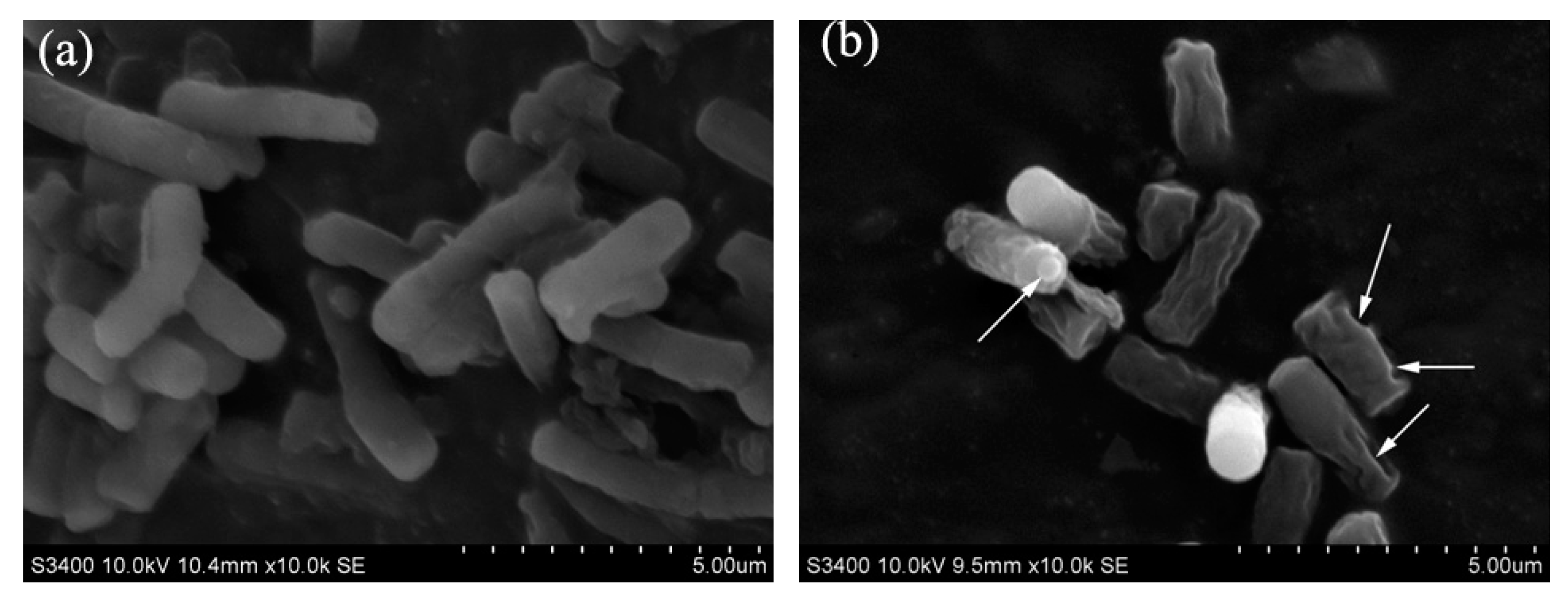 SEM of E. coli treated with HAHp(5.6)-G MRPs at 37 °C for 3 h. (a) Control group, and (b) treated group.