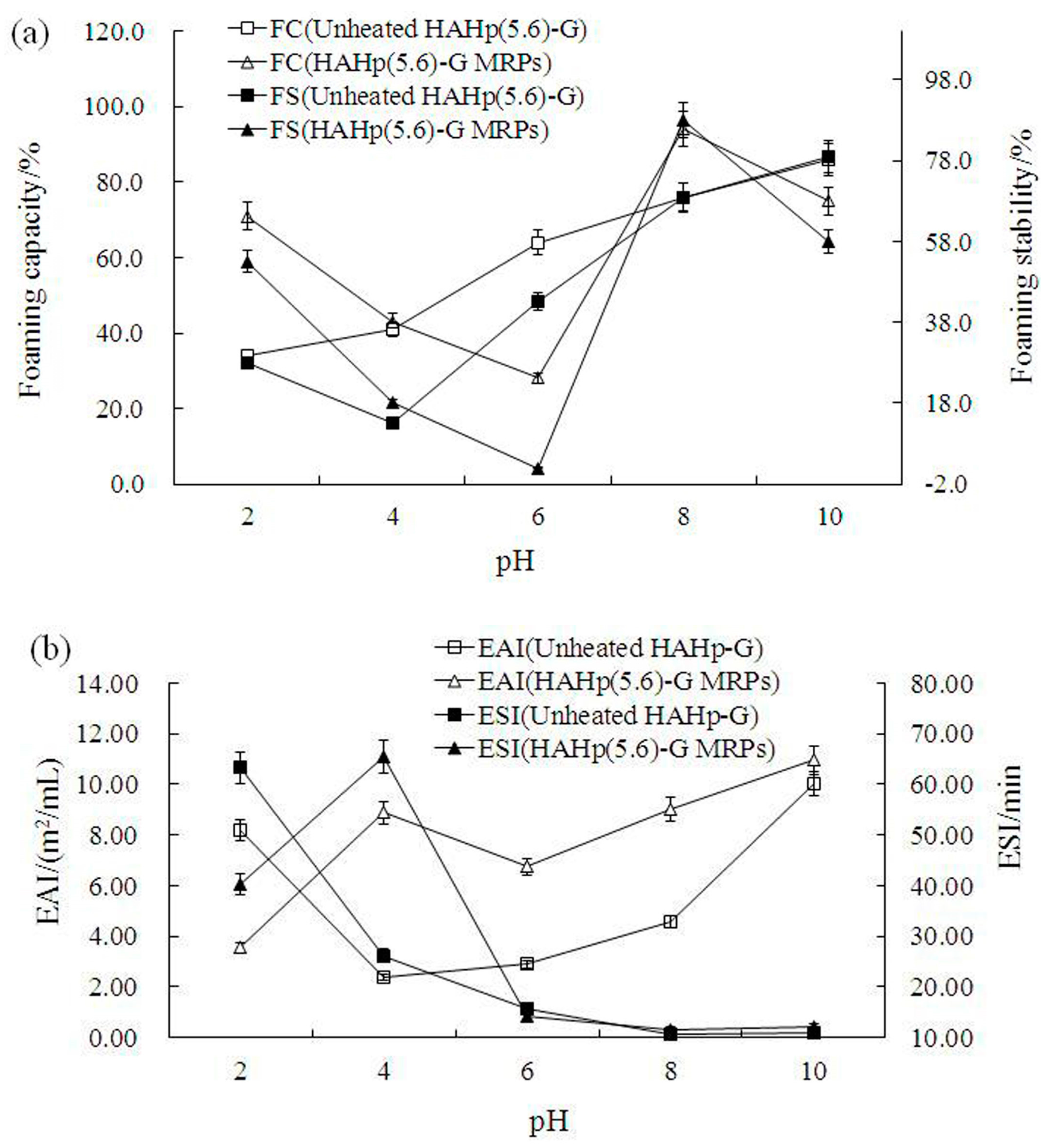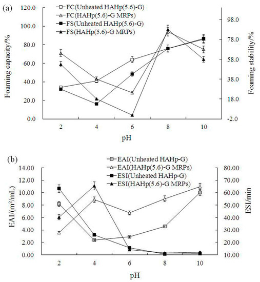 The colloidal behavior of proteins is influenced by pH and consequently affects the techno-functionality of proteins and their incorporation into various foods [11]. In this study, the functional properties including foaming capacity (FC), foaming stability (FS), emulsifying activity index (EAI), and emulsion stability index (ESI) for HAHp(5.6)-G MRPs and unheated HAHp(5.6)-G, both having undergone the same pH condition in a pH range were investigated. As shown in Figure 5a, the FC of HAHp(5.6)-G was enhanced with the increased pH values. The lowest FS for HAHp(5.6)-G was observed at the pH 4.0 (12.5%), whereas the lowest and highest FC of HAHp(5.6)-G MRPs were found at pH 6.0 (27.5%) and pH 8.0 (94.5%), respectively. Similar to the result of FC, HAHp(5.6)-G MRPs demonstrated the lowest and the highest FS at pH 6.0 (2.0%) and pH 8.0 (87.5%), respectively. The nature of the film in the foam and the extent of protein-protein or peptides interaction within the matrix could determine the FS of proteins or peptides [55].