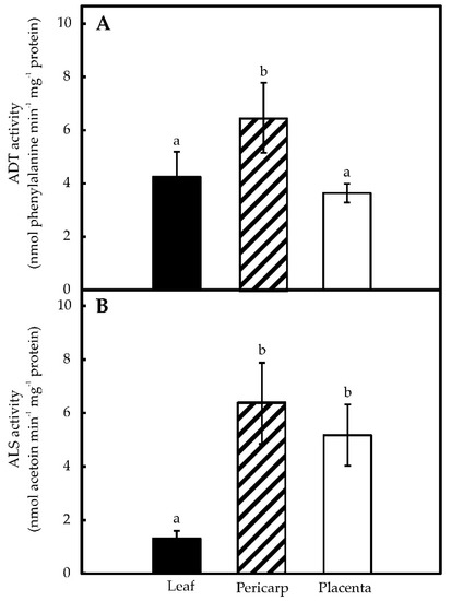 Arogenate dehydratase (ADT) (A) and acetolactate synthase (ALS) (B) specific activities in leaves, pericarps and placentas from C. chinense. Data represent mean ± standard deviation (S.D.) of three independent experiments with three replicates. Bars labeled with different letters are significantly different (Tukey’s test, α = 0.05).