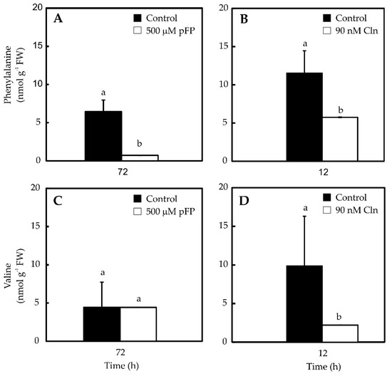 Phe (A and B) and Val (C and D) contents in placentas exposed to p-FP (A and C) and Cln (B and D). Data represent mean ± standard deviation (S.D.) of three independent experiments with three replicates. Bars labeled with different letters are significantly different (Tukey’s test, α = 0.05).