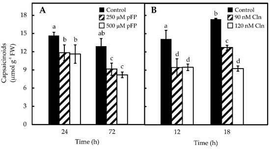 Effect of inhibition of Phe (A) and Val (B) synthesis on CAP contents in pepper placentas maintained in vitro. Data represent mean ± standard deviation (S.D.) of three independent experiments with three replicates. Bars labeled with different letters are significantly different (Tukey’s test, α = 0.05).