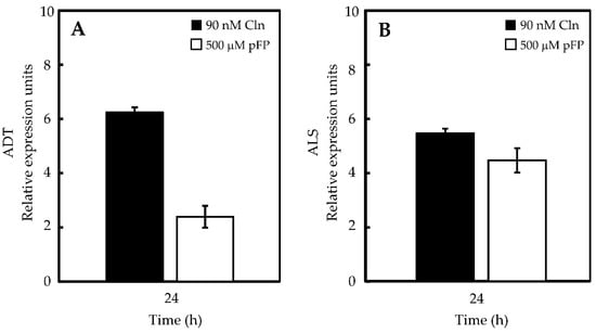 The relative abundance of the transcripts corresponding to the enzymes under study was also analyzed in the placentas treated with the inhibitors. Interestingly, hampering the synthesis of both amino acids led to an increase in the corresponding transcript levels (Figure 6). However, differences in the extent of these effects were noticed, i.e., inhibition of Val synthesis increased transcript accumulation for both ADT and ALS, although in a more pronounced fashion for ADT (Figure 6A); in contrast, the use of either inhibitor augmented ALS mRNAs in a similar fashion (Figure 6B).