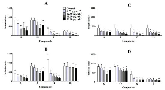 Peritoneal cells (1 × 105 cells/well) were added to 24-well plates containing circular coverslips. Plates were incubated for one hour at 37 °C/5% CO2 to allow cell adhesion and then 1 × 106 L. (L.) amazonensis promastigotes were added to each well. Plates were incubated at 35 °C/5% CO2 for four hours and then cells were treated for 24 h with synthetic compounds 4–19 (6.25–50 µg·mL−1). Amphotericin B (Sigma-Aldrich®) was used as the reference drug (0.25 to 2 µg·mL−1) and untreated cells were used as negative control. Coverslips were processed as described by Rizk et al. [35]. The overall number of amastigotes was determined by counting 100 cells in six replicates. The half maximal inhibitory concentration (IC50) was calculated using a nonlinear regression curve. Infection index was obtained as described by Paladi et al. [36].
