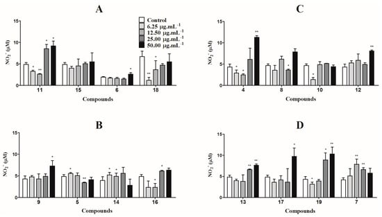 Nitric oxide release by L. amazonensis infected macrophages 24 h after treatment with 1,4-diaryl-1,2,3-triazole derivatives (4–19) of the neolignans 1–3. Bars represent the mean ± SD of six replicates. * p ≤ 0.05, ** p ≤ 0.01, for the different concentrations compared to untreated cells (control) (Student’s t-test). (A) trimethoxy series; (B) dimethoxy series; (C) methoxy series; (D) methylenedioxy series (substitution pattern of ring A).
