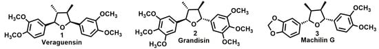 Sixteen 1,4-diaryl-1,2,3-triazole derivatives with substitution patterns found in the neolignans veraguensin 1, grandisin 2, and machilin G 3 (Figure 3) were tested. They were designed based on the concept of the bioisosterism of rings, where the tetrahydrofuran core was substituted by a 1,2,3-triazole ring (Figure 4) [12].