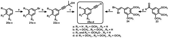 Retro-Favorski reaction of 22a–c with KOH under reflux in toluene generated the terminal acetylenes 25a–c with 75% to 79% yield [12,28,29,30]. Ethynyl-1,2,3-trimethoxybenzene 25d was synthesized by the Corey-Fuchs method (Scheme 1) [12,31].