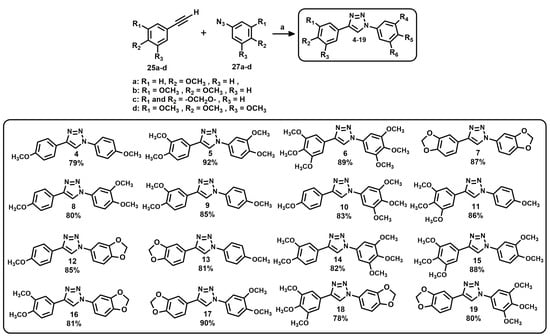 General method for the obtaining of 1,4-diaryl-1,2,3-triazole derivatives 4–19 [12,31]: (a) 25a–d (2 mmol), 27a–d (2 mmol), CuSO4·5H2O (0.128 mmol), sodium ascorbate (0.352 mmol), CH2Cl2/H2O (4 mL), room temperature, 24 h.