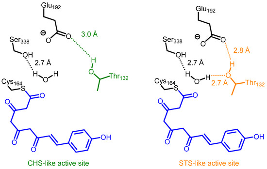 Structure-based mutagenic transformation of alfalfa CHS into STS established that STS’s alternative cyclization specificity is due to a conformational backbone change in a short, concealed loop between residues 132 and 137 in alfalfa CHS, that spans the dimer interface in the active site. Several amino acid substitutions at buried sites adjacent to this loop bring about a slight displacement of Thr132, a residue that is conserved in both CHS and STS. Consequently, the side chain hydroxyl group of Thr132 is brought within the hydrogen bonding distance of a Ser338-stabilized water molecule adjacent to the catalytic cysteine, and a different active site hydrogen bond network involving Glu192-Thr132-H2O-Ser338 forms in STS (Figure 3) [24,26,31]. The nucleophilic water activated by this “aldol-switch” hydrogen bond network subsequently participates in the cleavage of the thioester bond of the cysteine-bound linear tetraketide intermediate. With the absence of the ester bond at C1, the intermediate is able to undergo a C2 to C7 aldol condensation and ultimately generates a stilbene scaffold. Intriguingly, when an ester bond is present at C1, a C6 to C1 Claisen condensation prevails [26,32]. Hence in the case of CHS and STS, the functional divergence is determined by electronic factors rather than steric effects of the active site cavity. This also explains the cross-reactivity of CHS and STS previously identified by Yamaguchi and co-workers [30]. Nevertheless, the amino acid substitutions which result in a displacement of Thr132 are varied in different STSs, probably due to gene duplication and convergent evolution. Further biochemical and structural studies on similar proteins will be required to delineate the molecular basis in greater detail [31].