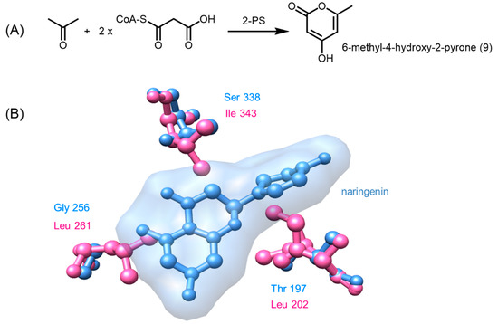 Despite 2-PS and CHS sharing at least 70% amino acid sequence identity and identical catalytic residues, 2-PS catalyzes the condensation of an acetyl-CoA starter molecule with only two units of malonyl-CoA to form a triketide, which further undergoes lactonization to generate 6-methyl-4-hydroxy-2-pyrone (9, Figure 4) [34,35]. A closer inspection of the crystal structure of 2-PS (PDB ID: 1QLV) revealed that the active site of 2-PS is only approximately one third of the volume seen in CHS, owing to the greater steric bulk of three active site residues [24]. Intriguingly, the triple mutant T197L/G256L/S338I of alfalfa CHS was found to be functionally identical to 2-PS. The increased steric bulk at positions 197 and 338 occludes the coumaroyl-binding pocket, thus excluding big starter units such as phenylpropanoid CoA thioesters. Substitution of Gly256 in CHS with Leu261 in 2-PS reduces the size of the cyclization pocket of the active site, therefore limiting the number of chain extensions of the polyketide [24,35].