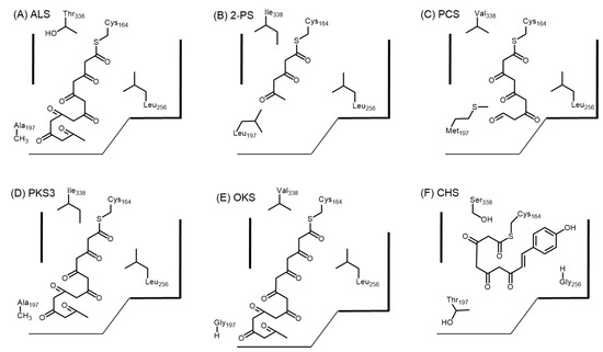 Schematic representation of the active sites of (A) R. Palmatum ALS; (B) G. hybrida 2-PS; (C) A. arborescens PCS; (D) A. arborescens PKS3; (E) A. arborescens OKS; and (F) M. sativa CHS. The residue at position 256 controls the starter unit selectivity. Bulky residues such as leucine prevents the entrance of starter acyl-CoAs such as p-coumaroyl CoA. The residue at position 197 controls the gate to an additional buried pocket that extends to the “floor” of the active site. Small residues such as alanine or glycine allows chain extension to form octaketides. Residue at position 338 located at the proximity of the catalytic Cys164 is at the “ceiling” of the active site cavity and this guides the growing polyketide chain to extend into the buried pocket near residue position 197. The numbering for all enzymes are based in M. sativa CHS.