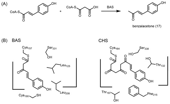 Comparison of the active sites of M. sativa CHS and R. palmatum BAS. (A) Synthesis of benzalacetone; (B) Schematic representations of the active site of BAS and CHS. The presence of Leu-208, Leu-125, and Cys-190 and the reorientation of Ser-331 in BAS changed the orientation of the starter acyl-CoA, p-coumaroyl-CoA, as well as the orientation of the growing polyketide intermediate, leading to the formation of benzalacetone.