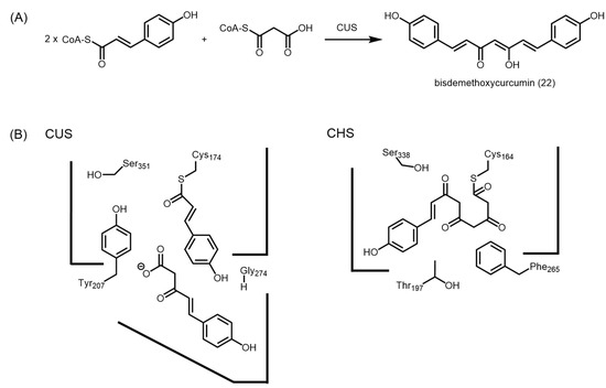 Comparison of the active sites of M. sativa CHS and O. sativa CUS. (A) CUS catalyzes the condensation between two units of p-coumaroyl-CoA and one unit of malonyl-CoA to form bisdemethoxycurcumin; (B) Schematic representations of the active sites of CUS and CHS. The presence of glycine at position 274 and tyrosine at position 207 orients the active site to allow longer polyketides to be generated.