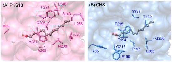 Surface view of arachidonic acid—(A) on the acyl-binding tunnel in E. siliculosus PhlD (PDB ID: 4B0N) and (B) superimposed on M. sativa CHS (PDB ID: 1CHW). Clashes between the corresponding residues in CHS that line the “tunnel” and arachidonic acid were observed (indicated by purple bonds on the residues).