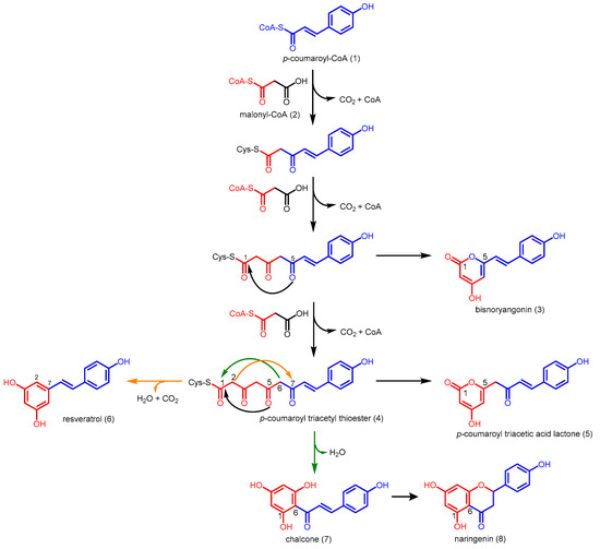 - Abe, I.; Morita, H. Structure and function of the chalcone synthase superfamily of plant type III polyketide synthases. Nat. Prod. Rep. 2010, 27, 809–838. [Google Scholar] [CrossRef] [PubMed]