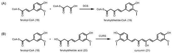 Bioynthesis of curcuminoids in C. longa. (A) DCS catalyzes the formation of feruloyldiketide-CoA, one of the rare ketides with a CoA still attached to the final product; (B) CURS catalyzes the formation of curcumin from feruloyl-CoA and feruloyldiketide via a rare head-to-head condensation.
