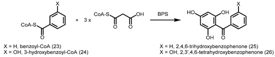 Among the starter-CoAs utilized by plant PKSs, benzoyl-CoA (23) is a rare starter unit greatly preferred only by two kinds of type III PKSs, benzophenone synthase (BPS) and biphenyl synthase (BIS) [50]. In cell cultures of Hypericum androsaemum (St. John’s wort family of plants), BPS catalyzes the decarboxylative condensation of three units of malonyl-CoA with one unit of benzoyl-CoA to form a tetraketide intermediate, which undergoes an intramolecular C6 to C1 Claisen condensation to give 2,4,6-trihydroxybenzophenone (25, Scheme 7) [51]. Intriguingly, H. androsaemum CHS showed 60% identity to BPS, and was able to utilize benzoyl-CoA as a starter with low activity to form benzophenone. However, BPS was unable to have any detectable activity with derivatives of cinnamoyl-CoA. Mutagenesis of three CHS residues lining the active site to their corresponding counterparts in BPS (L263M/F265Y/S338G) resulted in a mutant H. androsaemum CHS which preferred benzoyl-CoA to p-coumaroyl-CoA. This suggests a combination of amino acid changes can affect the coumaroyl-binding pocket of CHS, resulting in a greater substrate preference for benzoyl-CoA. Identical replacements (L263M/F265Y/S338G) were also found in the functionally similar Garcinia mangostana L. (mangosteen) BPS [52]. In cell cultures of the medicinal herb Centaurium erythraea, 3-hydroxybenzoyl-CoA (24) is the preferred starter CoA for BPS, giving rise to 2,3′,4,6-tetrahydroxybenzophenone (26, Scheme 7), the precursor of xanthones [53]. More structural studies are needed to provide insights as to why BPS is unable to utilize phenylpropanoid-CoA esters as starters.