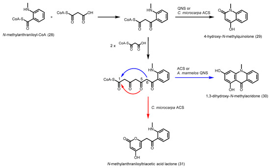 Recently, the crystal structures of ACS (PDB ID: 3WD7) and QNS (PDB ID: 3WD8) from Citrus microcarpa were solved and wide active site entrances were found in both PKSs, which enabled the access of the bulky N-methylanthraniloyl-CoA [59]. The V98A substitution, hypothesized to be important for m-substituted phenyl substrate selectivity [24], was only found in R. graveolens ACS [58] but not in the other ACS and QNSs identified so far [59]. C. microcarpa ACS was found to be a highly promiscuous enzyme with a large active site cavity, being able to accept different starter CoAs to generate chalcone, benzophenone, and phloroglucinol scaffolds in addition to the production of 4-hydroxy-N-methylquinolone (29), 1,3-dihydroxy-N-methylacridone (30), and N-methyl-anthraniloyltriacetic acid lactone (31, Scheme 9).