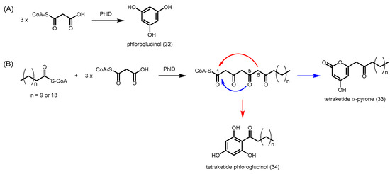 Most plant type III PKSs have evolved to use CoA-esters derived from phenylpropanoid metabolism as starters, but some functionally divergent PKSs are adapted to utilizing long-chain acyl-CoAs. Previous studies on Petroselinum hortense (parsley) CHS in the 1980s showed that type III PKSs can be promiscuous enzymes [22]. In addition to the natural substrate p-coumaroyl-CoA, parsley CHS was able to utilize several aliphatic CoA esters as starters, such as butyryl-CoA and hexanoyl-CoA, which were converted efficiently to acylphloroglucinols. Nevertheless, these short chain fatty acyl-CoA esters are unlikely to occur at the site of flavonoid biosynthesis, and the purpose of having activity with these substrates remained unknown. Recently, phloroglucinol synthase (PhlD) from Ectocarpus siliculosus (brown alga) was found to be able to synthesize phloroglucinol (32) from three units of malonyl-CoA (Scheme 10A), and a positive correlation was identified between reacclimation to seawater and the phloroglucinol content in cells [60]. The phloroglucinol synthase was also able to catalyze the decarboxylative condensation of three units of malonyl-CoA with one unit of lauroyl-CoA (n = 9) or palmitoyl-CoA (n = 13) to form tetraketide α-pyrones 33 and acylphloroglucinols 34 (Scheme 10B).