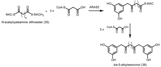 Alkyl-resorcylic acid synthase 2 (ARAS2) from O. sativa catalyzes the synthesis of bis-5-alkylresorcinols using alkanedioic acid N-acetylcysteamine (NAC) dithioester (35) and malonyl-CoA (Scheme 11) [61]. One of the two NAC groups is first converted into a resorcinol group, generating an intermediate. ARAS2 subsequently catalyzes the condensation of malonyl-CoA with the intermediate and convert the remaining NAC group into another resorcinol group, yielding bis-5-alkylresorcinol (36, Scheme 11). This is analogous to the two-step reaction by curcuminoid synthase (CUS), although the mechanism of synthesis is different. ARAS2 uses two different starters and the same extenders for bis-5-alkylresorcinol biosynthesis, while CUS utilizes the same starters and two different extenders for the biosynthesis of bisdemethoxycurcumin. More structural studies are needed to provide insights into the unusual substrate specificities of ARAS2.