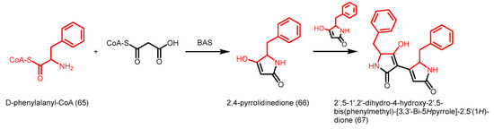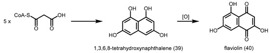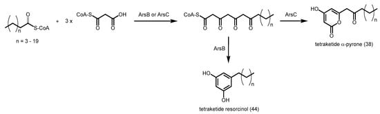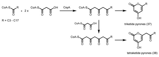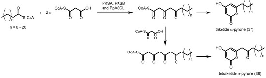 Recently, alkylpyrone synthases from Arabidopsis thaliana (PKSA and PKSB) were found to be able to produce triketide and tetraketide α-pyrones 37 and 38 from the decarboxylative condensation of malonyl-CoA with medium-chain to long-chain, and hydroxylated fatty acyl-CoAs (Scheme 12) [62]. These tetraketide α-pyrones are important for sporopollenin biosynthesis during pollen grain development, while the triketide α-pyrones are thought to be derailment products. Although these PKSs are related to CHS, they do not display CHS activity. A similar anther-specific chalcone synthase-like enzyme from Physcomitrella patens (PpASCL) was also discovered; the enzyme catalyzes the condensation malonyl-CoA with saturated acyl-CoAs (C6–C20), unsaturated acyl-CoAs (C16:1 or C18:1) or hydroxyl fatty acyl-CoAs to generate alkyl and hydroxyalkyl α-pyrones that are important for moss spore wall formation [63].