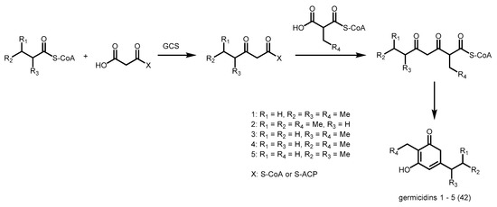 - Chemler, J.A.; Buchholz, T.J.; Geders, T.W.; Akey, D.L.; Rath, C.M.; Chlipala, G.E.; Smith, J.L.; Sherman, D.H. Biochemical and structural characterization of germicidin synthase: Analysis of a type III polyketide synthase that employs acyl-acp as a starter unit donor. J. Am. Chem. Soc. 2012, 134, 7359–7366. [Google Scholar] [CrossRef] [PubMed]