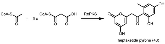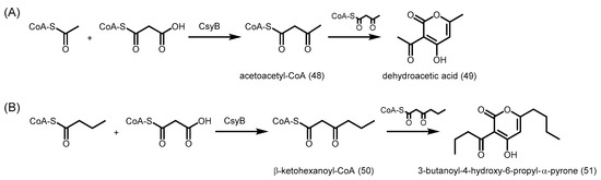 - Hashimoto, M.; Koen, T.; Takahashi, H.; Suda, C.; Kitamoto, K.; Fujii, I. Aspergillus oryzae csyb catalyzes the condensation of two beta-ketoacyl-coas to form 3-acetyl-4-hydroxy-6-alkyl-alpha-pyrone. J. Biol. Chem. 2014, 289, 19976–19984. [Google Scholar] [CrossRef] [PubMed]
