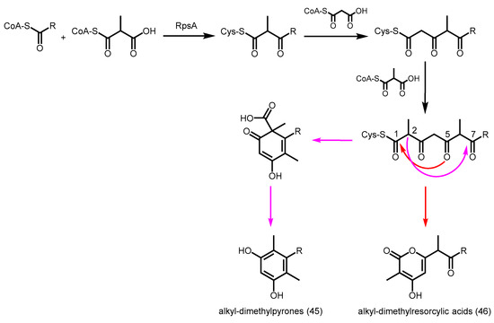 - Awakawa, T.; Sugai, Y.; Otsutomo, K.; Ren, S.; Masuda, S.; Katsuyama, Y.; Horinouchi, S.; Ohnishi, Y. 4-hydroxy-3-methyl-6-(1-methyl-2-oxoalkyl)pyran-2-one synthesis by a type III polyketide synthase from Rhodospirillum centenum. ChemBioChem Eur. J. Chem. Biol. 2013, 14, 1006–1013. [Google Scholar] [CrossRef] [PubMed]
