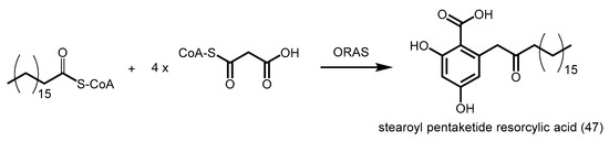 - Miyanaga, A.; Horinouchi, S. Enzymatic synthesis of bis-5-alkylresorcinols by resorcinol-producing type III polyketide synthases. J. Antibiot. 2009, 62, 371–376. [Google Scholar] [CrossRef] [PubMed]
