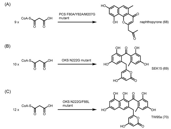 - Abe, I.; Morita, H.; Oguro, S.; Noma, H.; Wanibuchi, K.; Kawahara, N.; Goda, Y.; Noguchi, H.; Kohno, T. Structure-based engineering of a plant type III polyketide synthase: Formation of an unnatural nonaketide naphthopyrone. J. Am. Chem. Soc. 2007, 129, 5976–5980. [Google Scholar] [CrossRef] [PubMed]