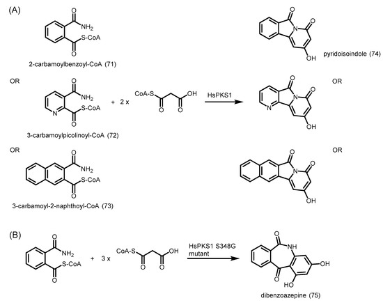 - Abe, I.; Abe, T.; Wanibuchi, K.; Noguchi, H. Enzymatic formation of quinolone alkaloids by a plant type III polyketide synthase. Org. Lett. 2006, 8, 6063–6065. [Google Scholar] [CrossRef] [PubMed]